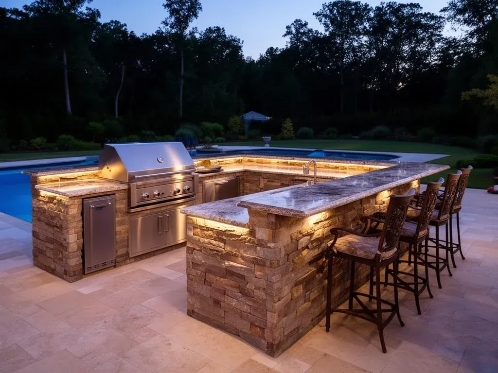 Transform your backyard into the ultimate entertaining destination with a fully custom outdoor kitchen featuring premium built-in grills, natural stone countertops, and stylish bar seating.
