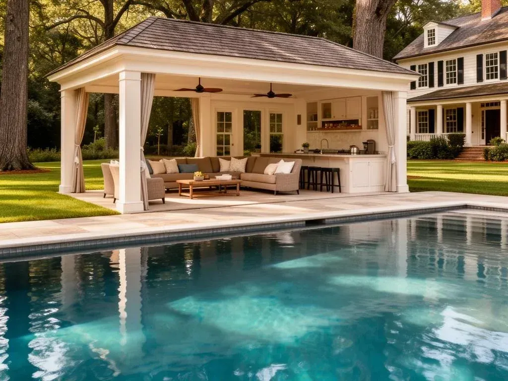 Elevate your poolside experience with a custom-designed pool house or cabana that offers the perfect blend of shade, convenience, and sophisticated style just steps from the water's edge.